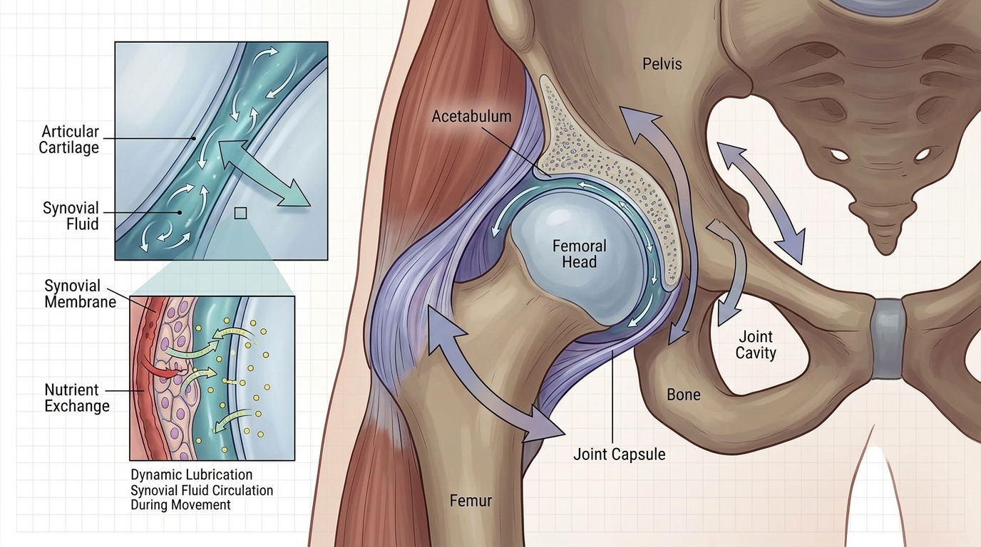 人間の股関節も全く同じです。股関節の軟骨には血管が通っていないため、血液から直接栄養をもらうことができません。ではどうやって栄養を取り入れているかというと、関節の中を満たしている「関節液」から栄養を得ているのです。