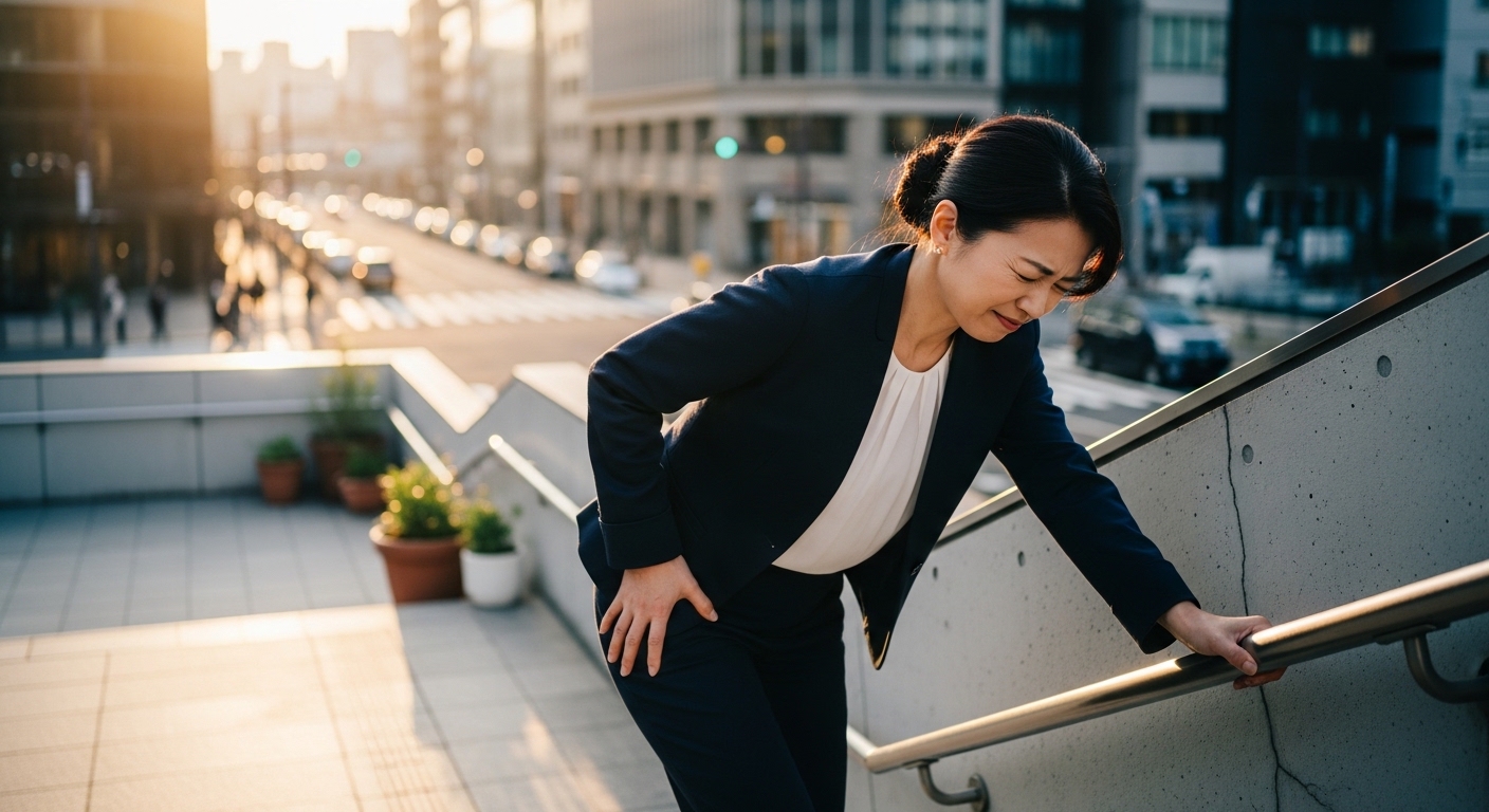 - 腰椎への影響: 股関節が動かない分を「腰」で補おうとするため、腰椎椎間板ヘルニアや脊柱管狭窄症を併発し、激しい腰痛や足のしびれに悩まされるようになります。